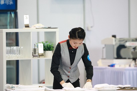 餐具摆放需要间隔相等、餐巾折叠需要完全一致、4个客人4杯水齐平、操作时任何材料不可以掉出容器之外……赛前机械地重复这些的项目,并且细抓每一个打分点,过程枯燥,对于陈延的耐心是一个考验,而更让她为难的是用英语和客人交流。