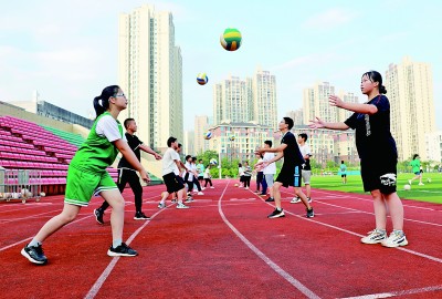 暑假来临,四川省华蓥市在部分学校试点开办体育托管班,开设排球、篮球、足球、羽毛球等体育项目免费培训,让中小学生在体育锻炼中享受乐趣、增强体质,丰富他们的暑假生活。图为7月22日,参加暑期校园体育托管班的学生在双河第二中学练习排球垫球技术。(周松林摄)