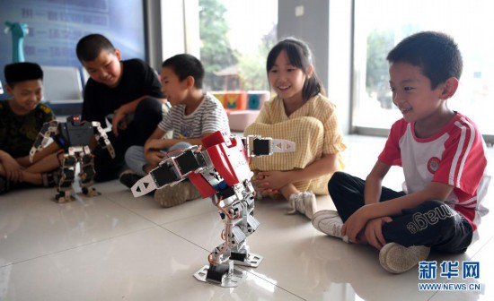 7月28日,孩子们在陕西铜川王家砭村“复兴少年宫”的科创课上观看机器人舞蹈。