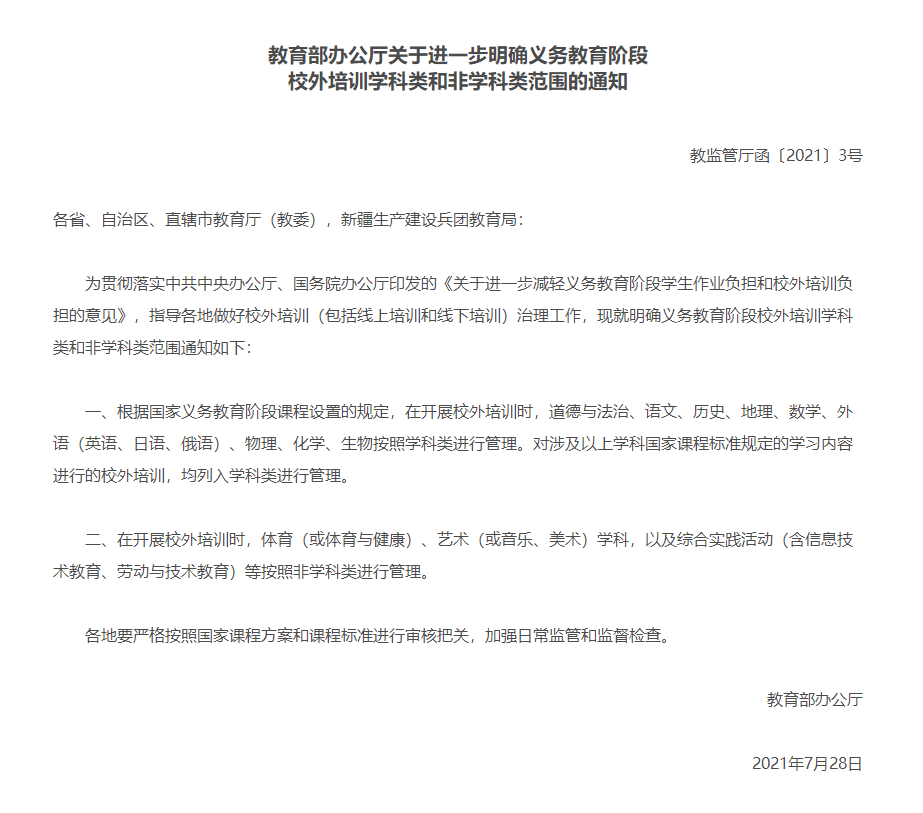 伟德国际1946bv官网北京7月30日电 (孙竞、李依环)日前,教育部办公厅发布《关于进一步明确义务教育阶段校外培训学科类和非学科类范围的通知》(下称《通知》)。