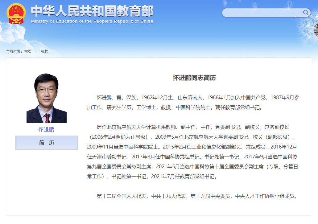 根据公开的简历,怀进鹏曾任北京航空航天大学党委副书记、校长,2009年当选中国科学院院士。2015年起,先后担任工业和信息化部副部长、天津市委副书记等职。2017年8月任中国科协党组书记、书记处第一书记。2021年5月当选中国科协第十届全国委员会副主席(专职,分管日常工作)、书记处第一书记。2021年7月任教育部党组书记。