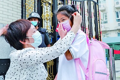 八月三十一日,北京小学广外分校的老师在校门口为忘记戴口罩的学生佩戴、整理口罩。新华社记者 张玉薇摄