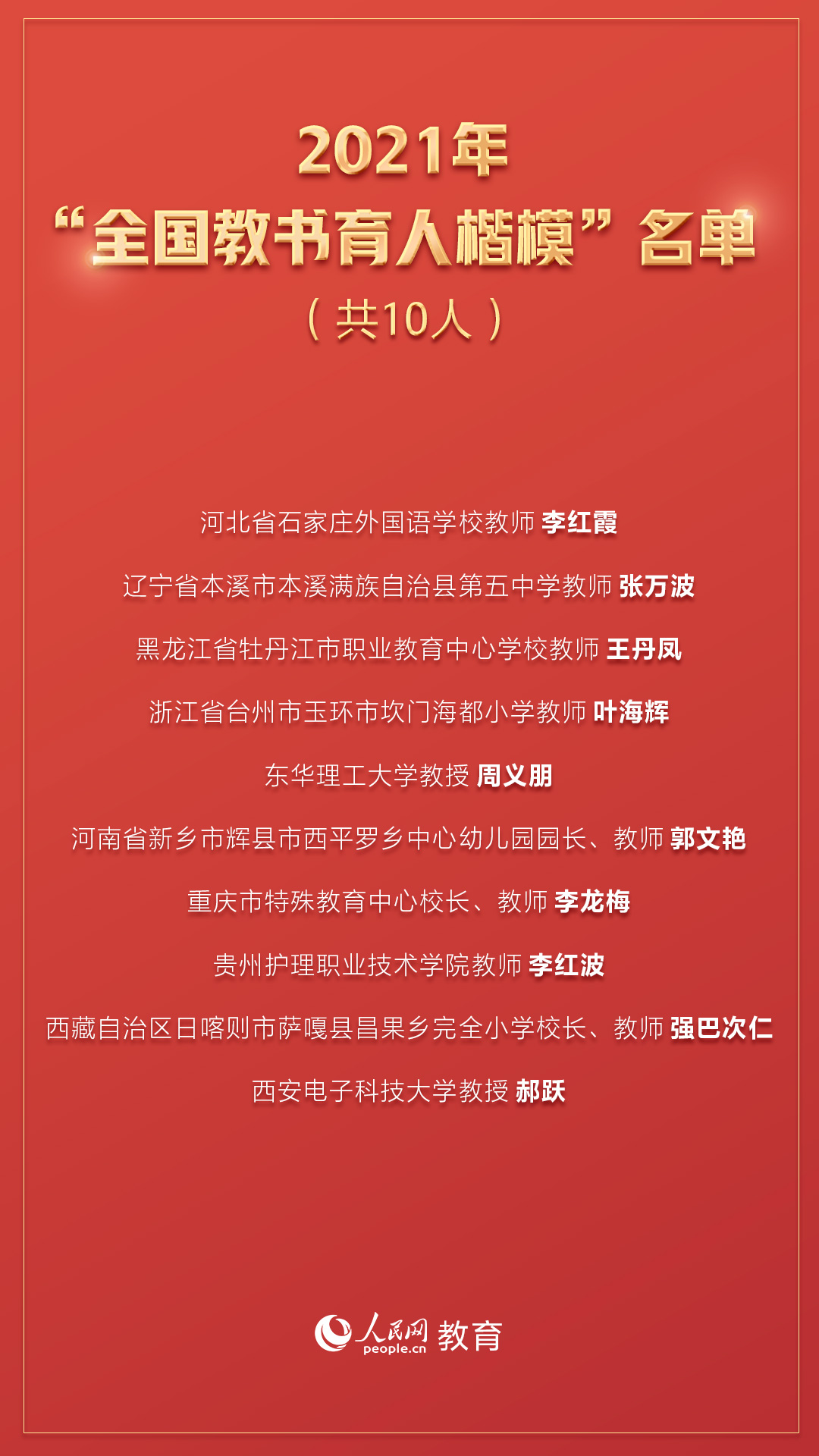 公示结束后,推选委员会组织召开推选会,结合公示反馈情况,通过分组推选、大会评定、无记名投票等环节,产生了10位全国教书育人楷模。他们是:河北省石家庄外国语学校教师李红霞,辽宁省本溪市本溪满族自治县第五中学教师张万波,黑龙江省牡丹江市职业教育中心学校教师王丹凤,浙江省台州市玉环市坎门海都小学教师叶海辉,东华理工大学教授周义朋,河南省新乡市辉县市西平罗乡中心幼儿园园长、教师郭文艳,重庆市特殊教育中心校长、教师李龙梅,贵州护理职业技术学院教师李红波,西藏自治区日喀则市萨嘎县昌果乡完全小学校长、教师强巴次仁,西安电子科技大学教授郝跃。