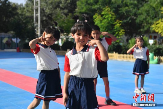 9月27日,新疆和田县布扎克乡库木村幼儿园,小朋友在嬉戏玩耍。当日,据该幼儿园园长维吾尔族姑娘阿尔孜古丽·阿力木介绍,该园由北京市援建,可容纳300名学生,目前有14名教师。 中新社记者 李雪峰/文 中新社记者 田雨昊/摄
