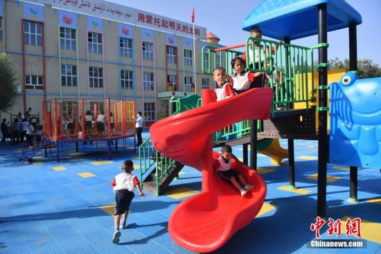 9月27日,新疆和田县布扎克乡库木村幼儿园,小朋友在玩滑梯。当日,据该幼儿园园长维吾尔族姑娘阿尔孜古丽·阿力木介绍,该园由北京市援建,可容纳300名学生,目前有14名教师。 中新社记者 李雪峰/文 中新社记者 田雨昊/摄
