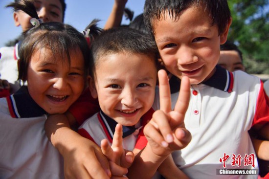 9月27日,新疆和田县布扎克乡库木村幼儿园,小朋友在嬉戏玩耍。当日,据该幼儿园园长维吾尔族姑娘阿尔孜古丽·阿力木介绍,该园由北京市援建,可容纳300名学生,目前有14名教师。 中新社记者 李雪峰/文 中新社记者 田雨昊/摄