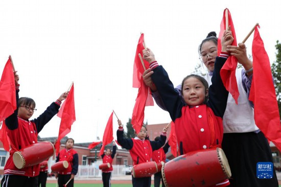 10月8日,河北省邢台市任泽区达二小学老师在指导学生练习打腰鼓。