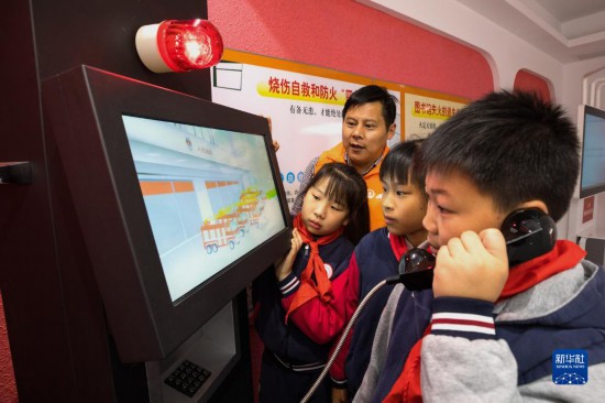 11月8日,在浙江省湖州市长兴县实验小学消防馆内,学生们体验消防报警流程。