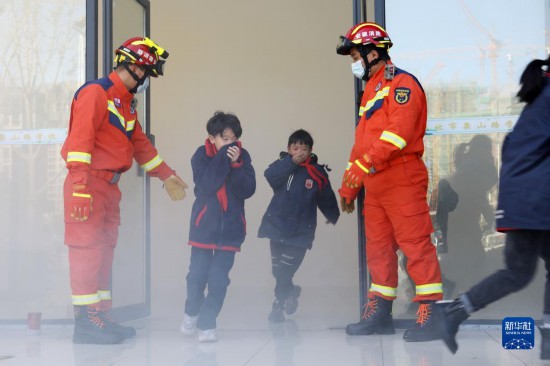 11月8日,在安徽省淮北市泉山路学校,学生们在消防员的引导下进行火场逃生演练。