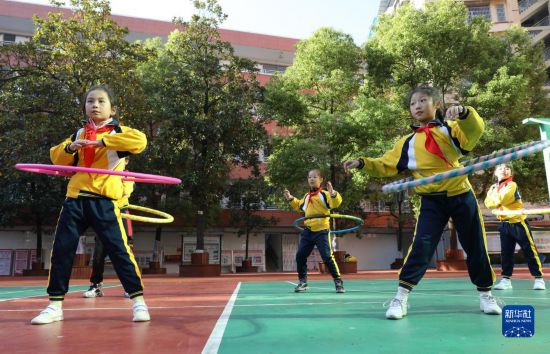 11月10日,衡阳市雁峰区环城南路小学的同学在玩呼啦圈。