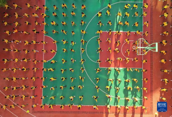 11月10日,衡阳市雁峰区环城南路小学的同学在做《国学武术操》(无人机照片)。