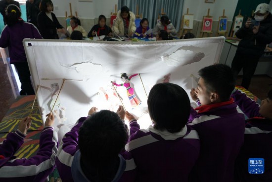 11月10日,平利县城关第三小学6年级5班的学生在学校皮影室内排练皮影戏。