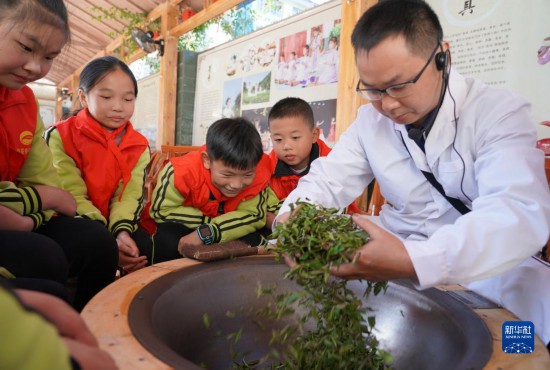 11月10日,在平利县田珍茶业有限公司的研学基地内,平利县长安镇中心小学5年级2班的学生在学习炒茶。