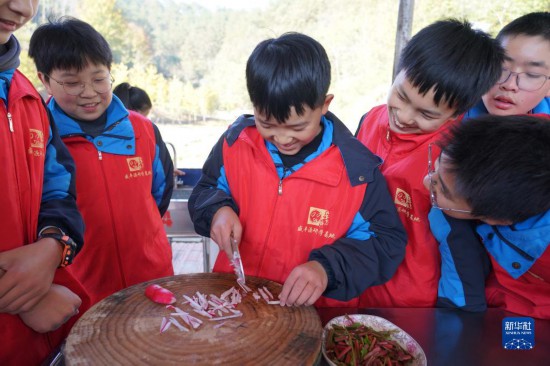 11月10日,在平利县盛丰源现代农业劳动教育研学实践基地内,平利县城关初中8年级18班的同学在切菜。