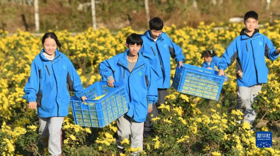 11月11日,在湖州市现代农业技术学校的实训基地,学生在搬运采摘的菊花。