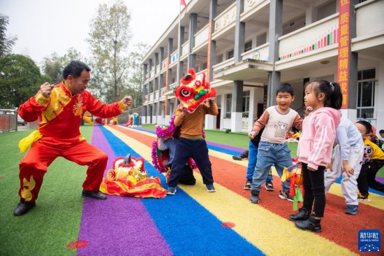 11月17日,在尧天坪镇幼儿园,龙狮艺人文麦秋(左一)带领学生练习舞狮动作。新华社记者 陈思汗 摄