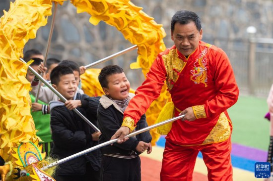 11月17日,在尧天坪镇幼儿园,龙狮艺人文麦秋(右一)带领学生练习舞龙。新华社记者 陈思汗 摄