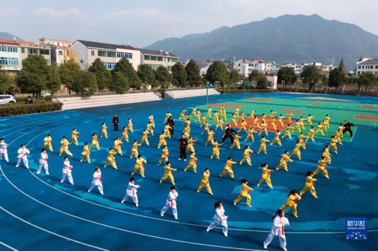 11月30日,赵家镇中心小学三年级的学生在非遗拳术特色课堂上学习“赵家拳棒”(无人机照片)。