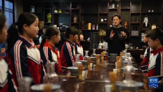 12月9日,在安义县古村群景区,工作人员带领学生体验“宋代点茶”。