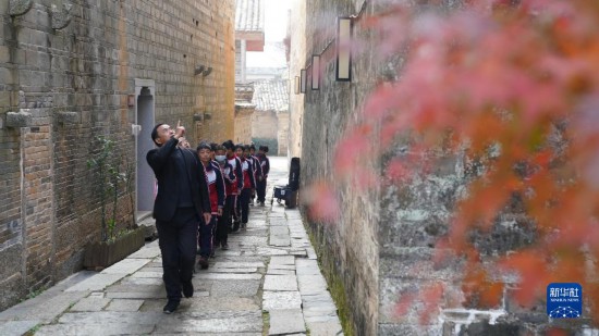 12月9日,在安义县古村群景区,工作人员带领学生参观。