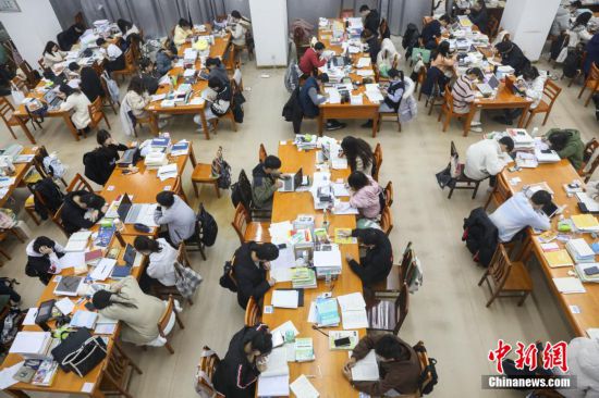 图为众多考研学生在南昌大学图书馆的自习室内复习备考。 刘力鑫 摄