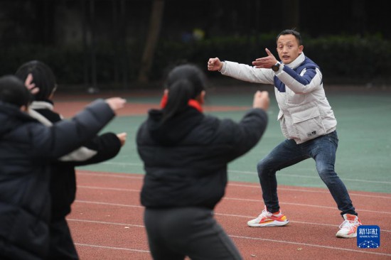 1月21日,在前童镇中心小学,童攀峰带领学生们开展舞狮基本动作训练。