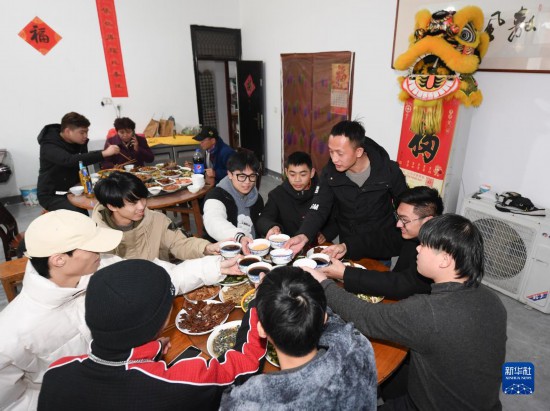 1月21日,在前童镇桥头杨村,童攀峰(站立者)在家里招待舞狮队成员进行年度聚会。