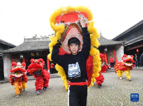 1月20日,在前童古镇祠堂,12岁的王世博在参加舞狮训练。
