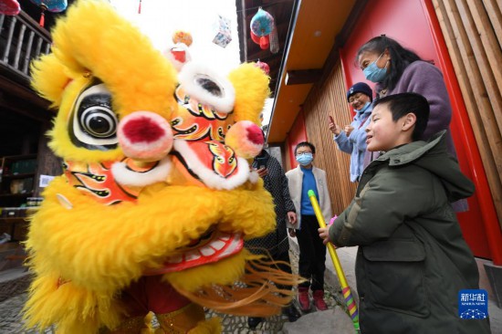 1月20日,在前童古镇老街上,正在训练的舞狮队员和小游客互动。