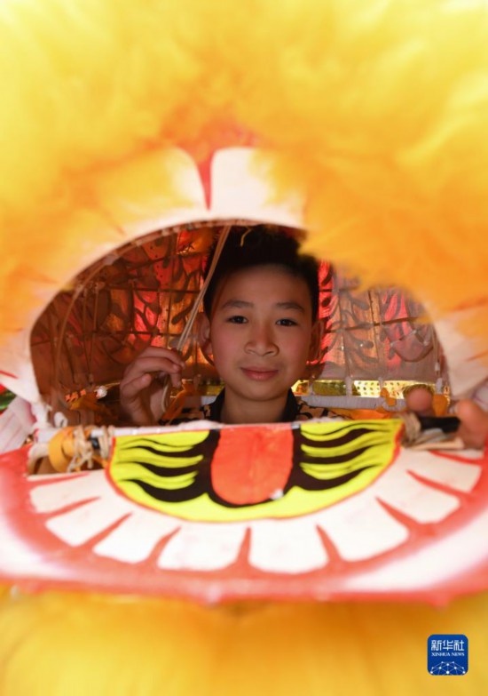 1月20日,在前童古镇,13岁的“少年狮王”张镇浩在练习间隙留影。