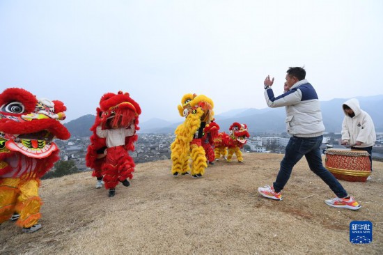 1月20日,在前童古镇边的小山上,童攀峰带领舞狮队进行训练。