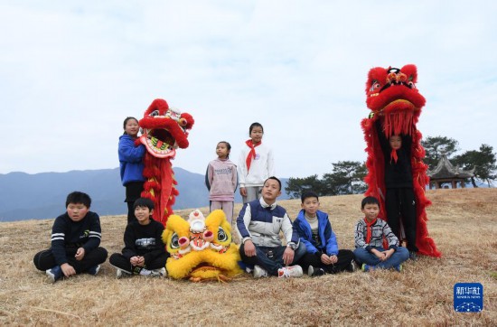 1月21日,童攀峰(前中)和部分舞狮队成员在前童古镇边的小山上合影。