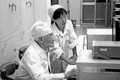 陆元九(左)在实验室与同事探讨问题。新华社发