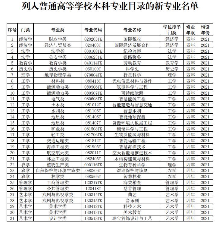 教育部公布2021年度高校新增和撤销本科专业名单 31种新专业纳入目录