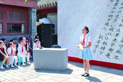 在北京举行的红色家风故事接力宣讲活动上,小代表诵读题为《写给1921》的一封信。新华社发