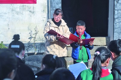 在浙江杭州临安区高虹镇举行的“传承红色基因 弘扬清廉家风”亲子朗诵比赛上,一对母子在朗诵好家风故事。新华社发