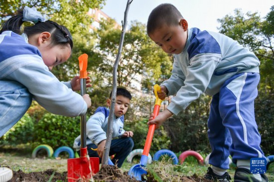 3月11日,江苏南京建邺区金地名京幼儿园的小朋友在栽植小树苗。