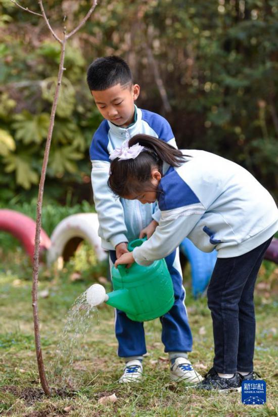 3月11日,在江苏南京建邺区金地名京幼儿园,小朋友给树苗浇水。