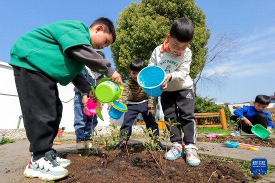 3月11日,浙江省湖州市长兴县李家巷镇中心幼儿园的小朋友给新栽种的小苗浇水。