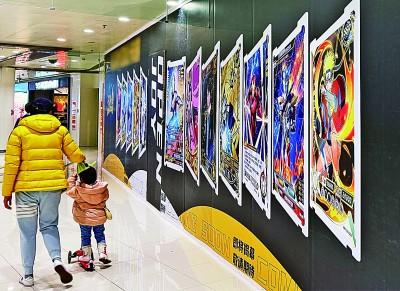 北京,家长带着孩子从卡牌连锁店广告前走过。光明图片/视觉中国