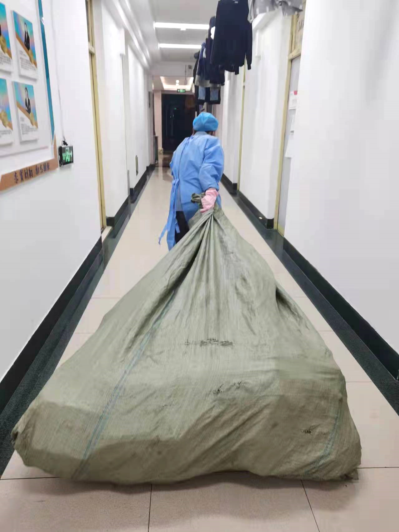 照片中,保洁阿姨身着蓝色防护服,从背后单手拖拽起庞大的垃圾编织袋,努力向前行走。空无一人的楼道里,只有阿姨瘦小单薄的背影。