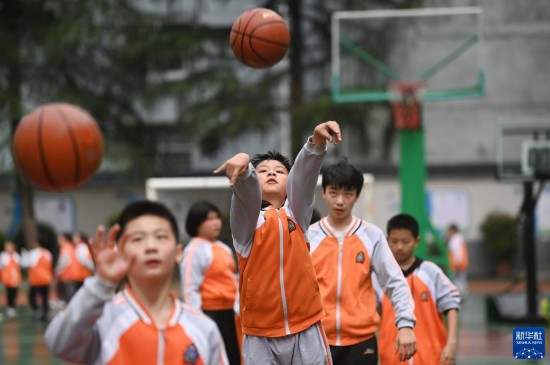 3月31日,岚皋县城关第二小学的学生在校园里进行篮球训练。
