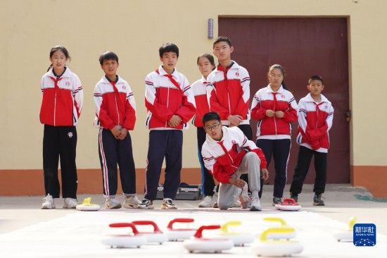4月18日,河北省邢台市内丘县实验小学学生在操场上练习陆地冰壶。