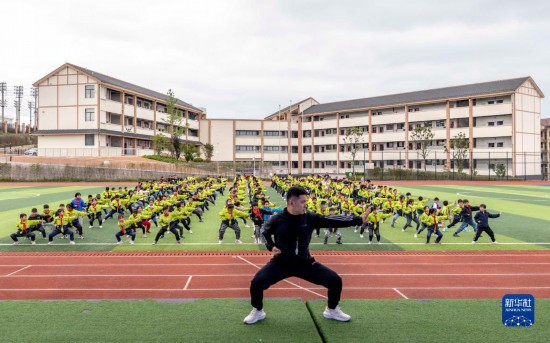 4月18日,贵州省黔西市锦绣学校学生进行武术操练习。