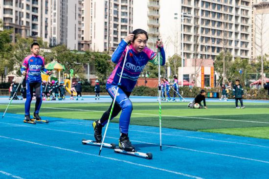 2022年2月24日,在重庆树人博文小学的冰雪运动体育课上,孩子们正在练习旱地滑雪。新华社记者唐奕摄