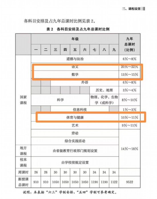 课时不变——体育仍是第三主科