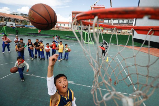 2020年6月14日,四川省阿坝藏族羌族自治州阿坝县民族寄宿制小学的学生在体育课上练习上篮。新华社记者沈伯韩摄