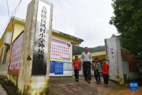 在广西贺州市昭平县五将镇良风村小学冲尾教学点,龚寿新老师领着学生走出校门(5月25日摄)。