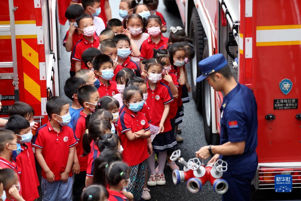 “六一”儿童节临近,湖南省资兴市消防救援大队举办开放日活动,资兴市小红花幼儿园30余名小朋友走进消防站,参观了解消防装备,学习消防知识,增强安全意识。新华社发(李科摄)