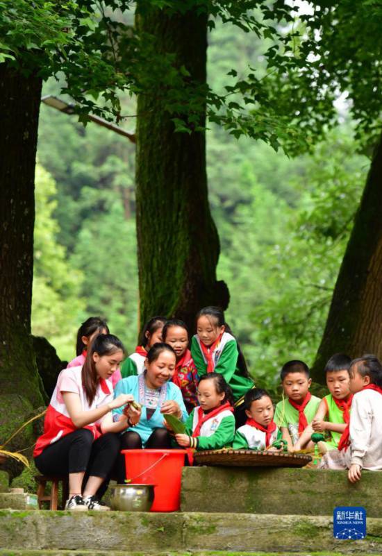 6月2日,在广西融水苗族自治县杆洞乡党鸠村,青年团员和小学生向村里的妇女学习包粽子。